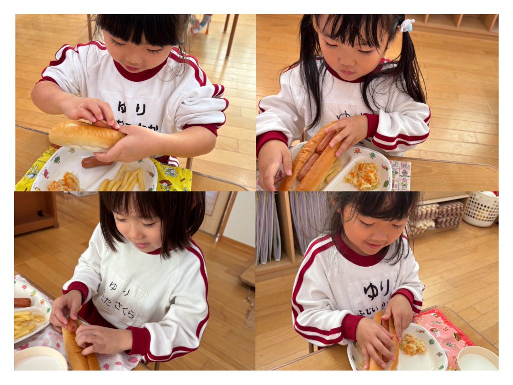 ケチャップ、キャベツのソテー、ウィンナーを自分で挟んでオリジナルのホットドックが完成しました!「何を挟もうかな〜」とお友達とお話しながら楽しんで作っていました😊